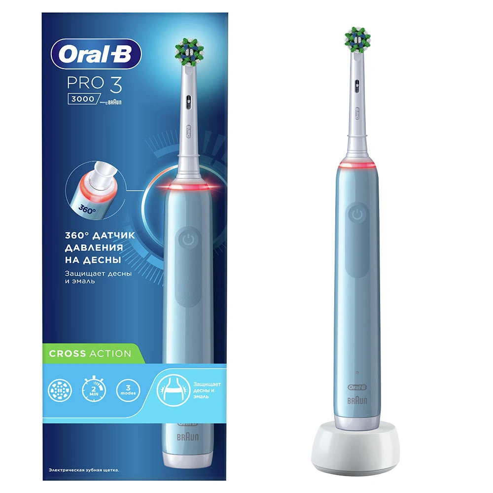 Oral-B Pro 3 3000 — электрическая зубная щетка в обновленном лаконичном дизайне с 3D-технологией чистки и визуальным 360-градусным датчиком давления.