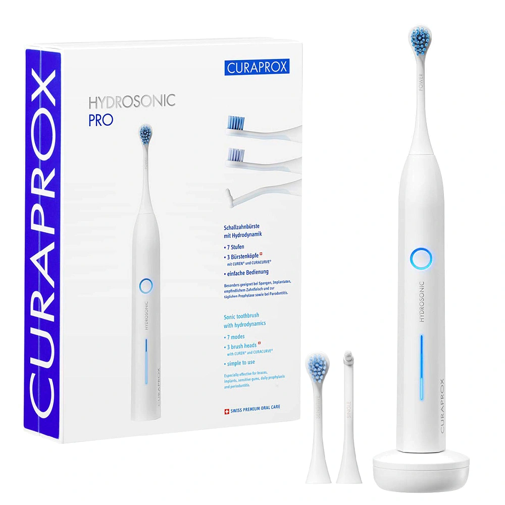 Hydrosonic PRO поддерживает звуковую технологию. Благодаря высокой скорости движения щетины (до 42 000 движений в минуту) в процессе чистки создается турбулентный поток из слюны и зубной пасты, который позволяет очистить межзубные промежутки, части ортодонтических и ортопедических конструкций. Зубная щётка CURAPROX Hydrosonic прекрасно подходит для чистки пломб, имплантатов, коронок, мостовидных протезов, виниров и брекетов.