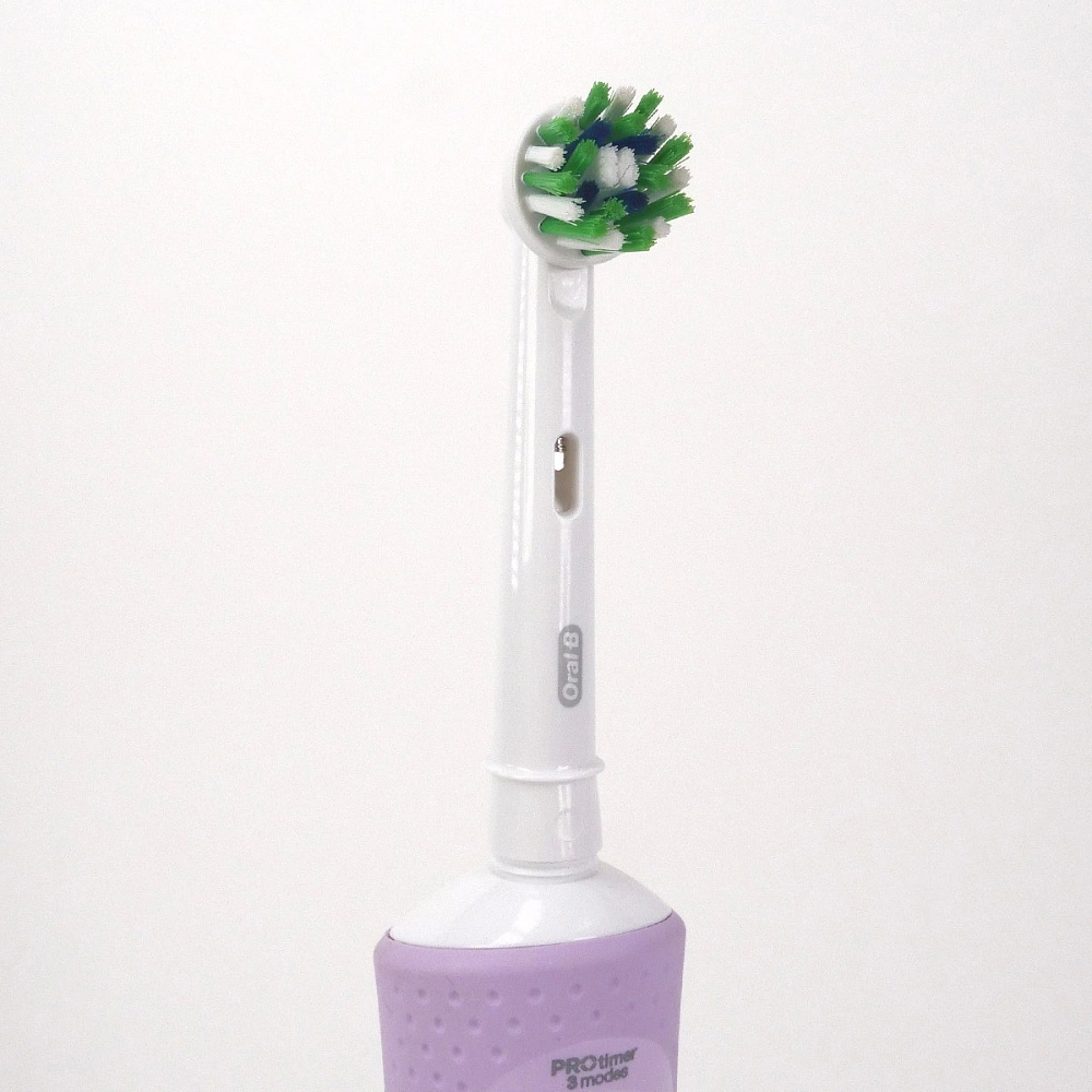щетинки, расположенные под углом, окружают каждый зуб, удаляя больше налёта даже из труднодоступных участков полости рта. Также щетинки меняют цвет от зеленого до желтого, подсказывая, когда пора заменить насадку, а закругленные кончики щетинок обеспечивают безопасность применения.