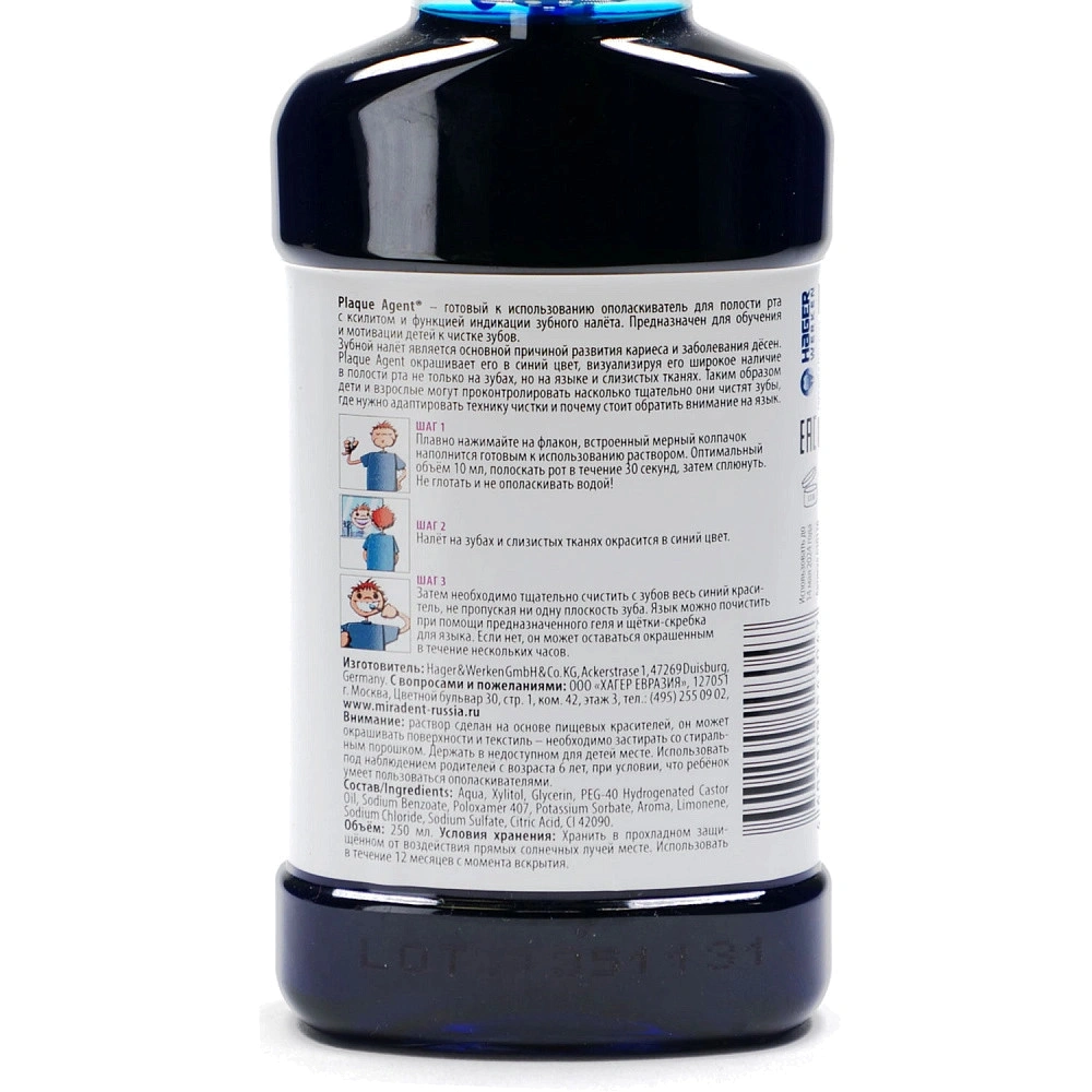 Просто налейте в мерный колпачок 10 мл ополаскивателя, дайте ребенку и скажите полоскать в течение 30 секунд, а затем сплюнуть. Эмаль окрасится в насыщенный синий цвет, который легко удалить зубной щеткой вместе с налетом — не очищенных мест на зубах не останется.