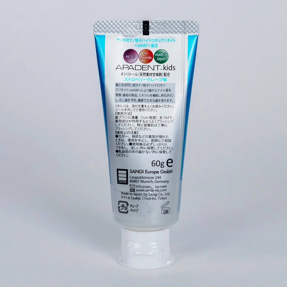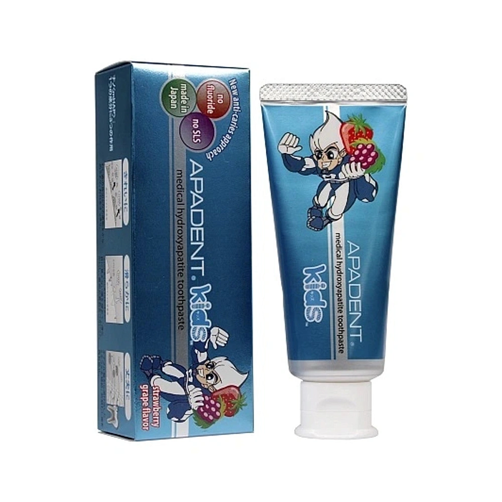 Зубная паста Apadent Kids предназначена для чистки и укрепления молочных  зубов с начала их прорезывания. Содержит медицинский нано-гидроксиапатит, искусственно синтезированный аналог натурального гидроксиапатита, составляющего 96% зубной эмали. Этот активный компонент заполняет микротрещины в эмали, делая ее гладкой и прочной. Он также восстанавливает минеральный баланс зубов, останавливая и излечивая кариес в стадии белого пятна. Apadent Kids снижает вероятность возникновения кариеса на детских молочных зубах на 47%. Приятный вкус и аромат земляники и винограда понравится вашему малышу и мотивирует его регулярно чистить зубы.