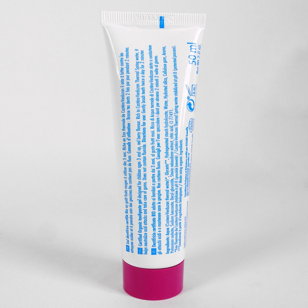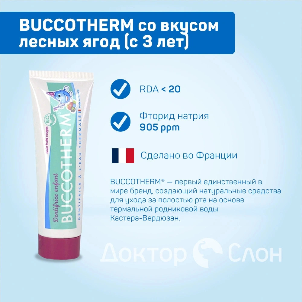 Детская зубная гель-паста Buccotherm создана для укрепления и заботы о здоровье полости рта ребенка. Содержит 51% уникальной термальной воды Castéra-Verduzan, насыщенной минеральными солями и полезными микроэлементами, которые необходимы для укрепления тонкой эмали молочных зубов. Активные вещества в составе оказывают противовоспалительное и антисептическое действие. Натуральный вкус лесных ягод привлекает ребенка к чистке зубов и надолго освежает дыхание.