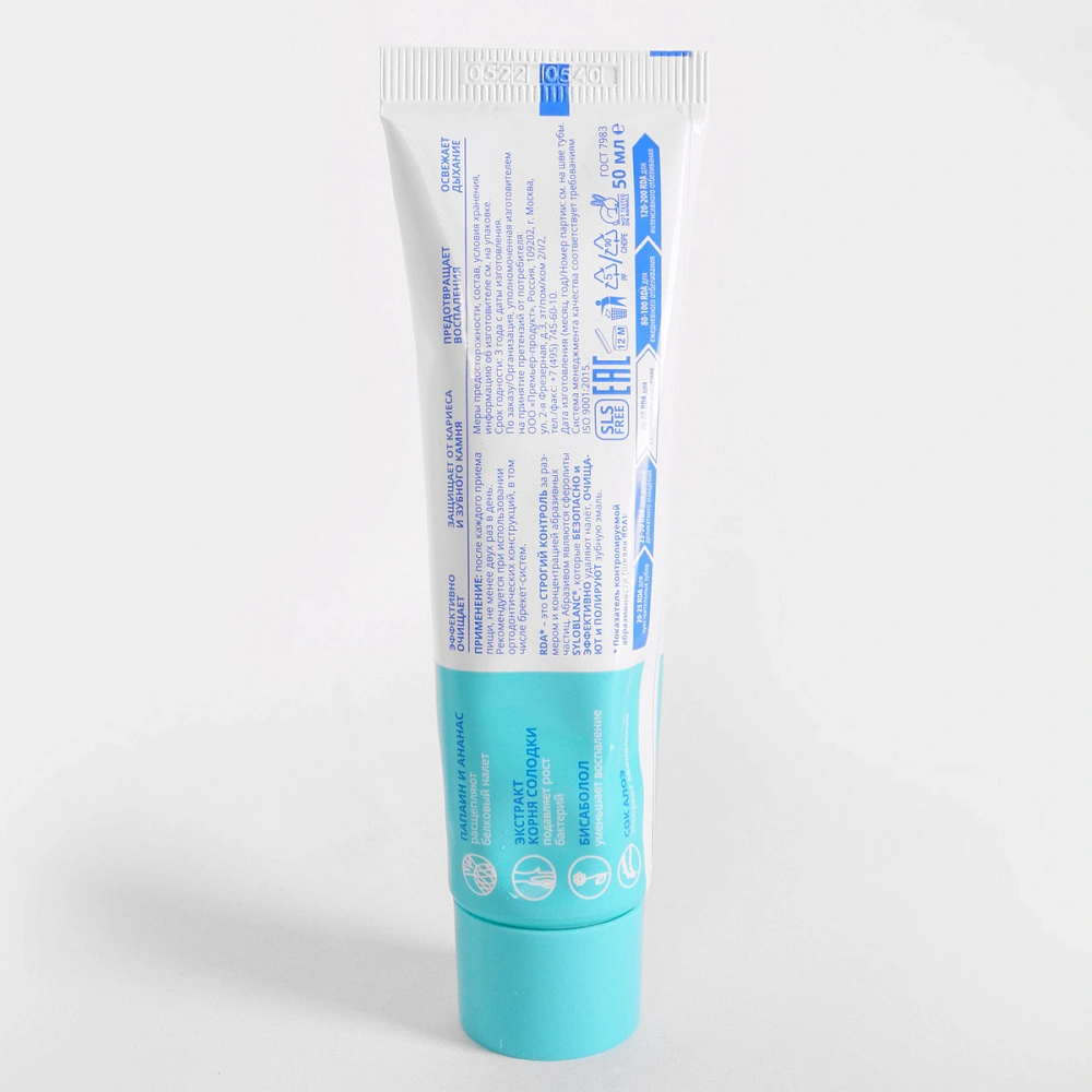 Сорбитол, вода, гидратированный диоксид кремния, глицерин, лаурилсаркозинат натрия, папаин, целлюлозная камедь, ксантановая камедь, ароматизатор, сок листьев алоэ вера, метилпарабен натрия, сахаринат натрия, фторид натрия, бисаболол, экстракт корня солодки, экстракт ананаса, пропилпарабен, Бриллиантовый синий.