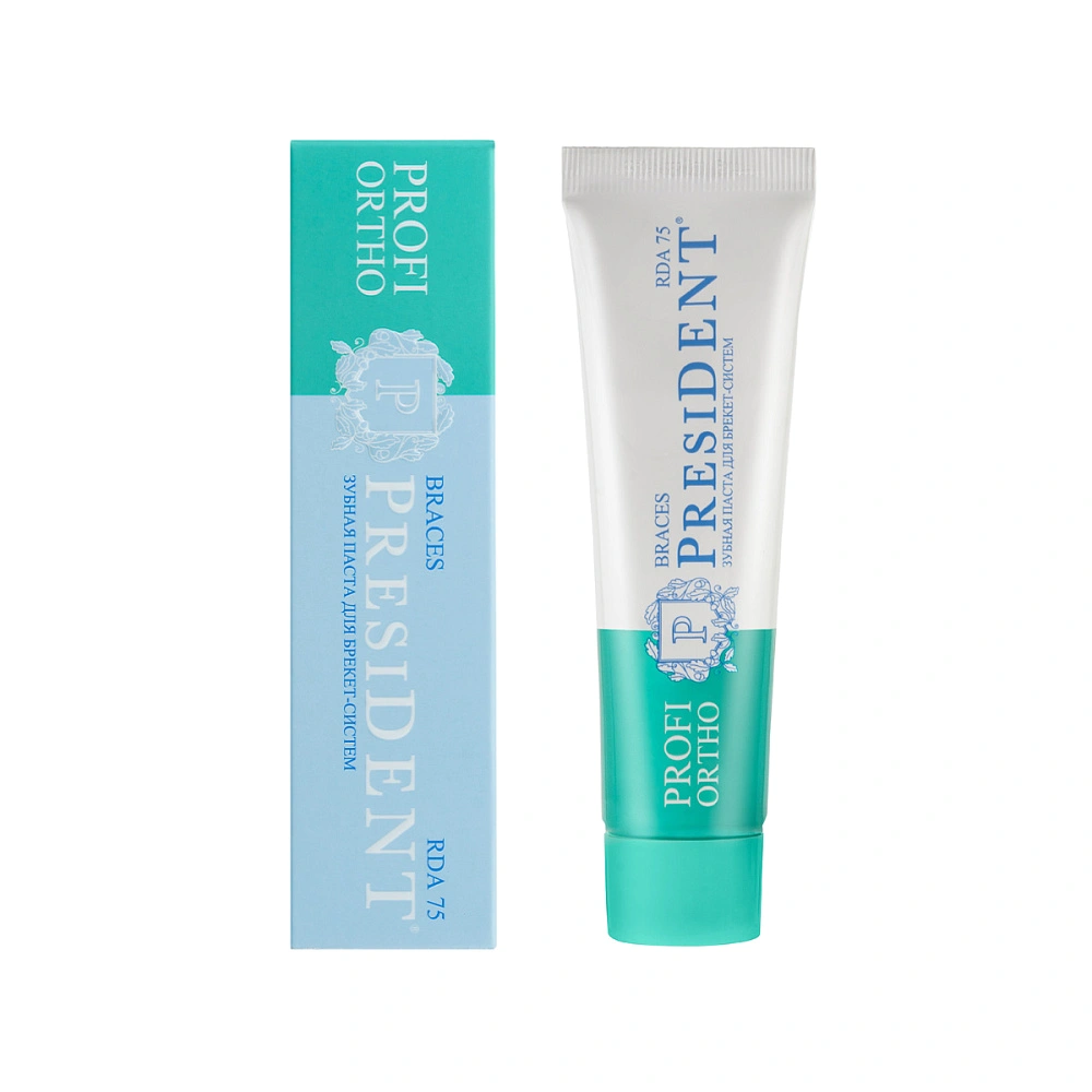 Уровень абразивности PresiDENT PROFI ORTHO — 75 RDA паста безопасно отбеливает зубы, не нанося вред эмали.