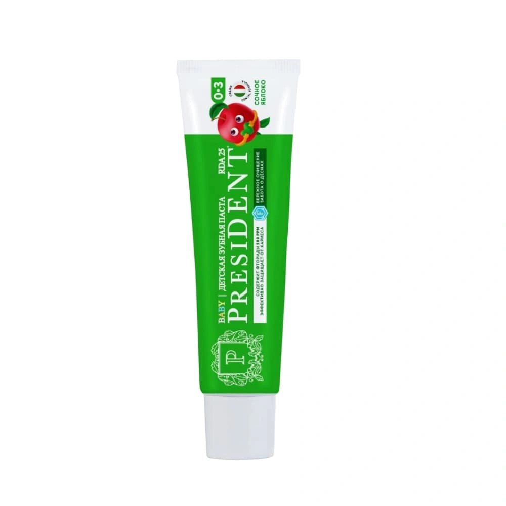 Детская зубная паста President «Сочное яблоко» - для малышей от 0 до 3 лет, которая обеспечивает комплексный уход за полостью рта благодаря фториду (500 PPM), биодоступному кальцию и алоэ вера. Паста гелеобразной консистенции с приятным вкусом яблока эффективно укрепляет эмаль, защищает от кариеса и предотвращает воспаления десен, при этом имеет контролируемую абразивность (RDA 25) для безопасного очищения хрупкой эмали молочных зубов.