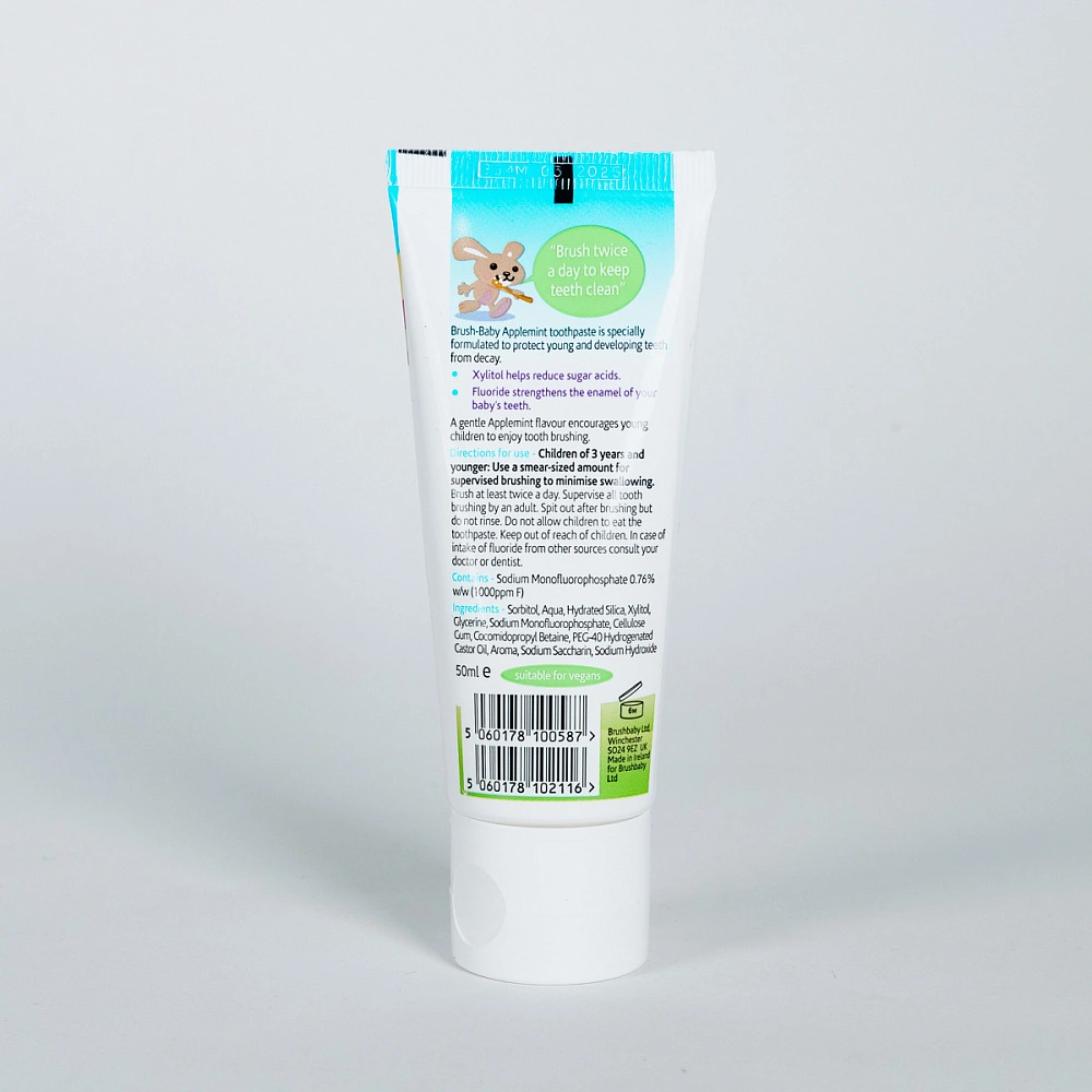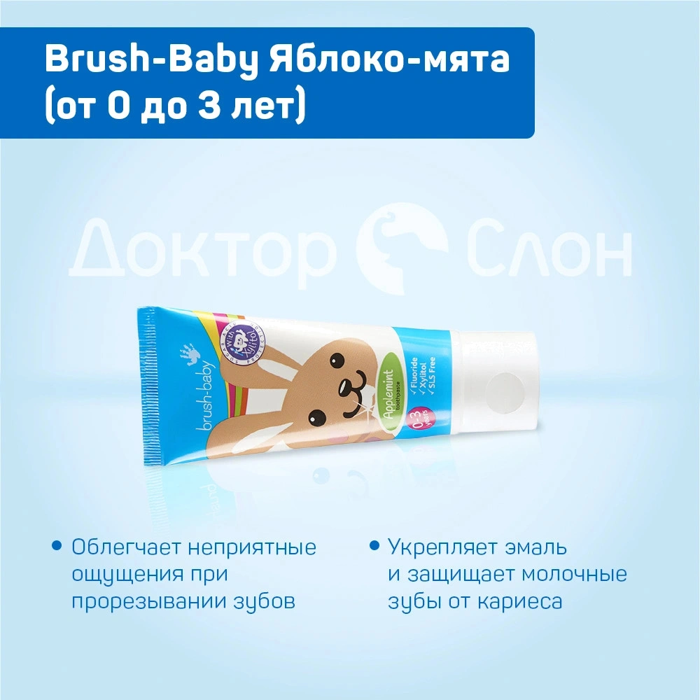 Детская зубная паста Brush-Baby со вкусом яблока и мяты разработана специально для чистки первых зубов. Подходит детям до 3 лет.