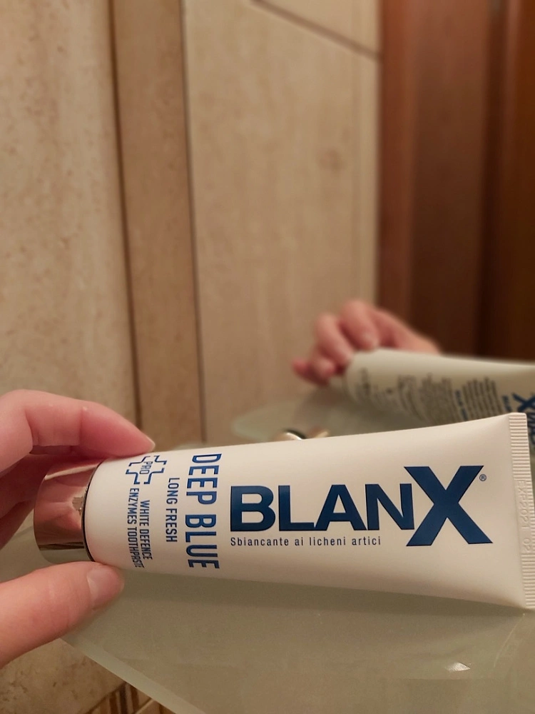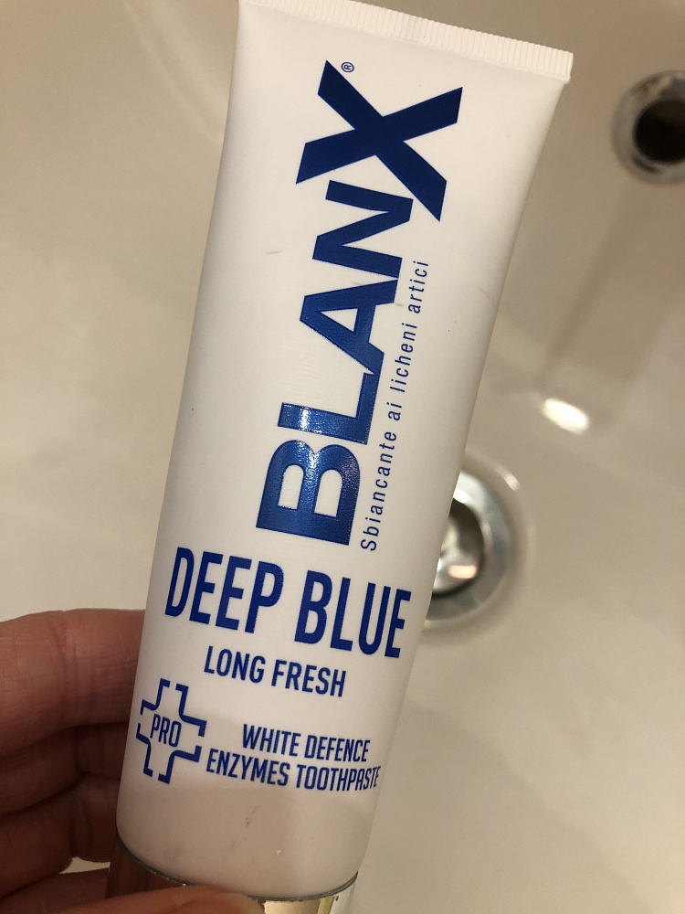 Blanx Pro Deep Blue - отбеливающая зубная паста для ежедневного использования, содержит экстракт исландского мха и отбеливающие ферменты папаин и бромелайн.