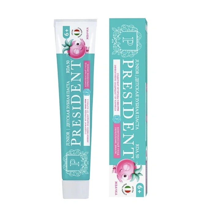 Зубная паста PRESIDENT – это гелеобразная зубная паста со вкусом жвачки, разработанная специально для детей старше 6 лет. Паста обеспечивает деликатный и эффективный уход за детскими зубами, при этом не содержит агрессивных компонентов и сахара.