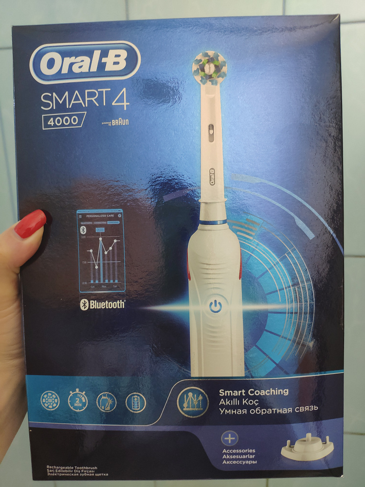 Электрическая зубная щетка Oral-B 4000 Smart Series с Bluetooth удаляет до двух раз больше зубного налета, чем мануальная зубная щетка. Oral-B Smart 4 4000 имеет возможность подключения к смартфону по Bluetooth для синхронизации с приложением Oral-B App, 2 насадки Cross Action в комплекте и 3 режима работы: Ежедневная чистка, Для чувствительных зубов, Отбеливание. Имеет 40000 пульсирующих и 8800 возвратно-вращательных движений в минуту. В комплект входит зарядная база и подставка для насадок.